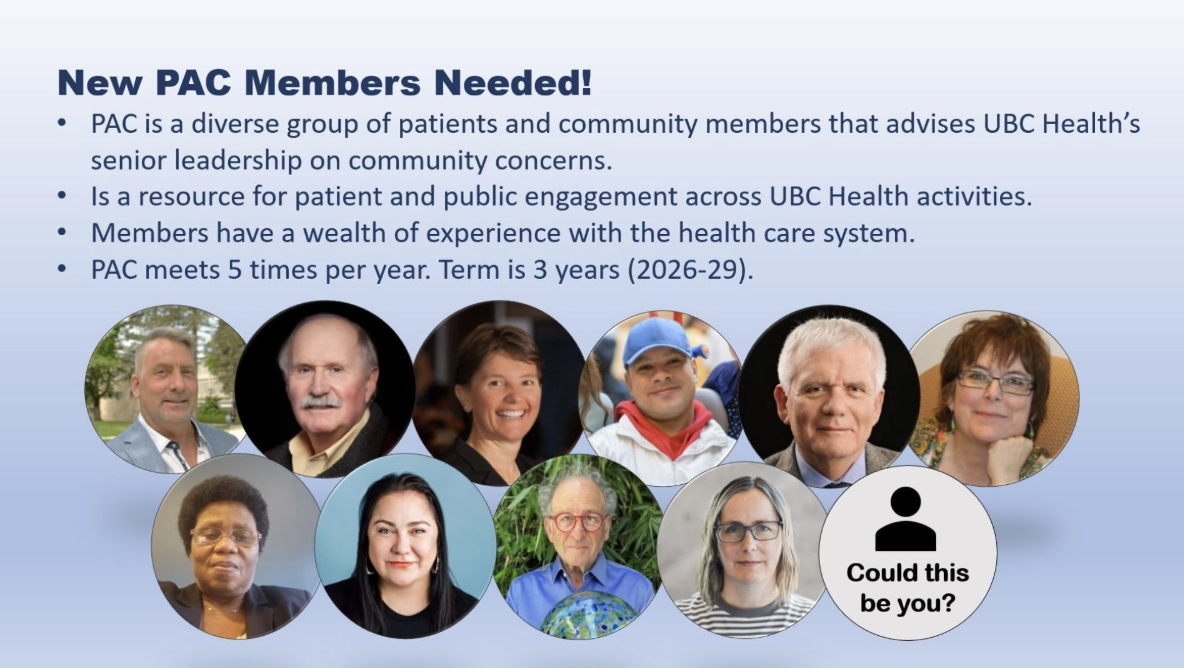 Want to have a say in the strategic directions of UBC Health? Apply to be a member of the Patient & Community Advisory Committee (PAC)!