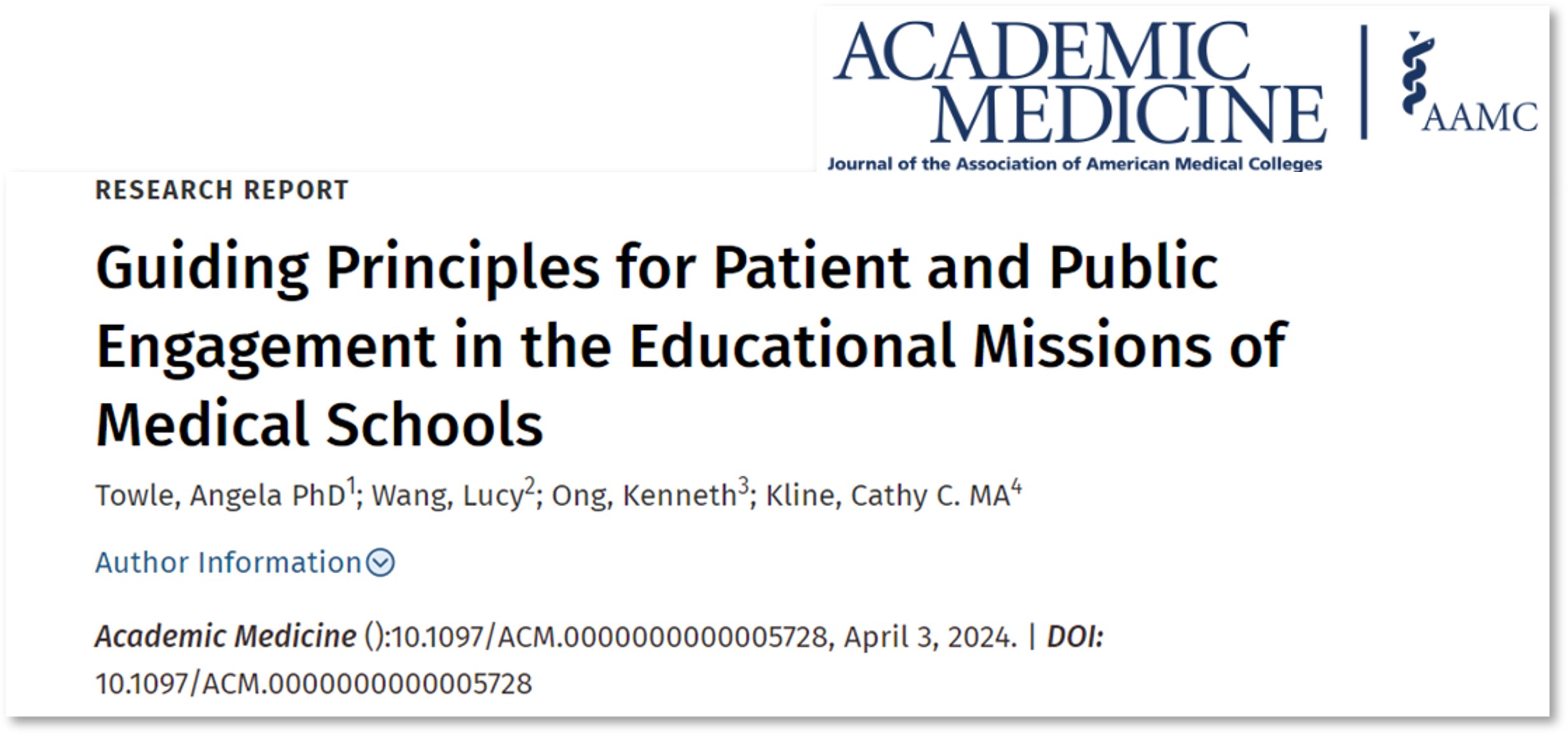 Towle A, Wang L, Ong K, Kline C. Guiding Principles for Patient and Public Engagement in the Educational Missions of Medical Schools. Academic Medicine: 10.1097/ACM.0000000000005728, April 3, 2024.