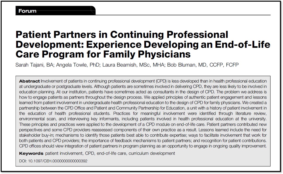We partnered on a new paper published in the Journal of Continuing Education in the Health Professions about involving patients in the design of continuing education for family physicians on end-of-life care.