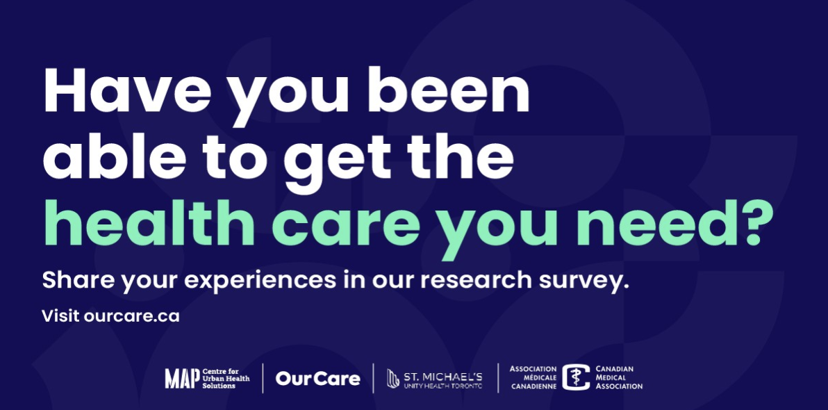 The OurCare project is being led by Dr. Tara Kiran from the MAP Centre for Urban Health Solutions. For more information, visit ourcare.ca. You are invited to take the survey. It only takes 10-15 minutes and is confidential.