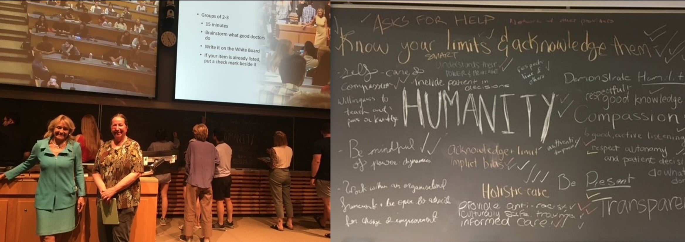 The session was part of a required course, MED 411 – Foundations of Medical Practice, which sets expectations for the medical profession and supports an introductory-level understanding of core medical concepts and skills. In this initial session, students were asked to reflect on what makes a good doctor. A good listener, compassionate, team player, and humility were some of the words the students used to describe what constitutes a good doctor.