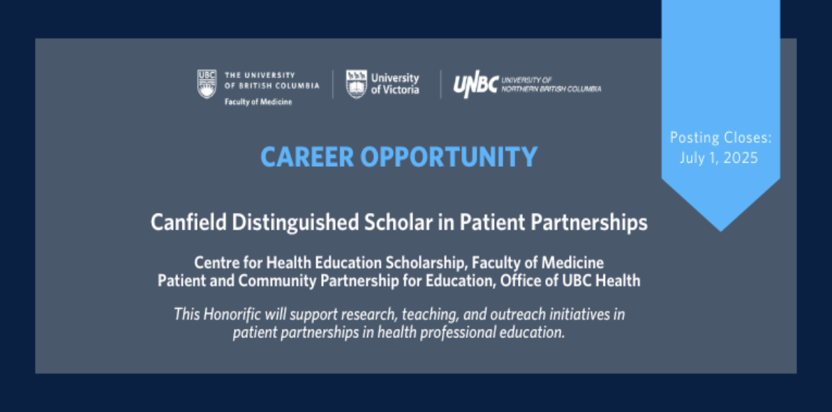 Applications are now open for the position of Canfield Distinguished Scholar in Patient Partnerships at UBC. This part-time honorific position for UBC faculty is an opportunity to support research, teaching, and outreach initiatives in patient partnerships in health professional education. It has been enabled through a partnership between the Patient & Community Partnership for Education in the Office of UBC Health and the Centre for Health Education Scholarship.